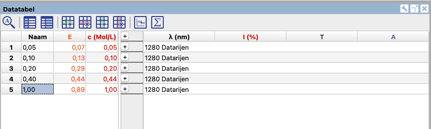 Figuur 1. Datatabel van een aantal metingen aan oplossingen van kopersulfaat. Aan de linkerkant wordt de concentratie en extinctie weergegeven. Via de iconen kunt kolommen en rijen verwijderen en/of toevoegen.