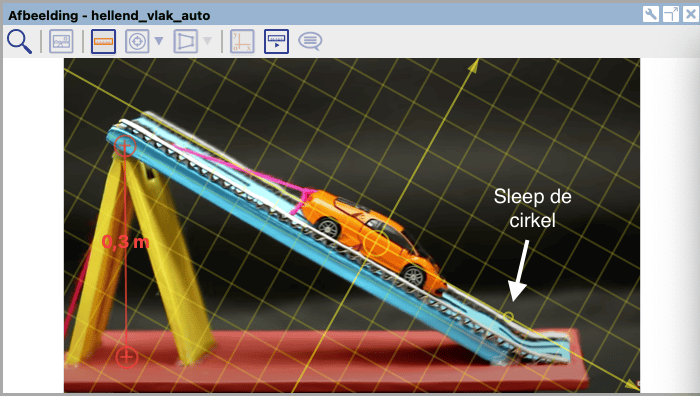 Figuur 1. Screenshot van een auto op een hellend vlak. Het assenstelsel is geroteerd met behulp van de kleine cirkel op de x-as. Ook het raster is aangezet.