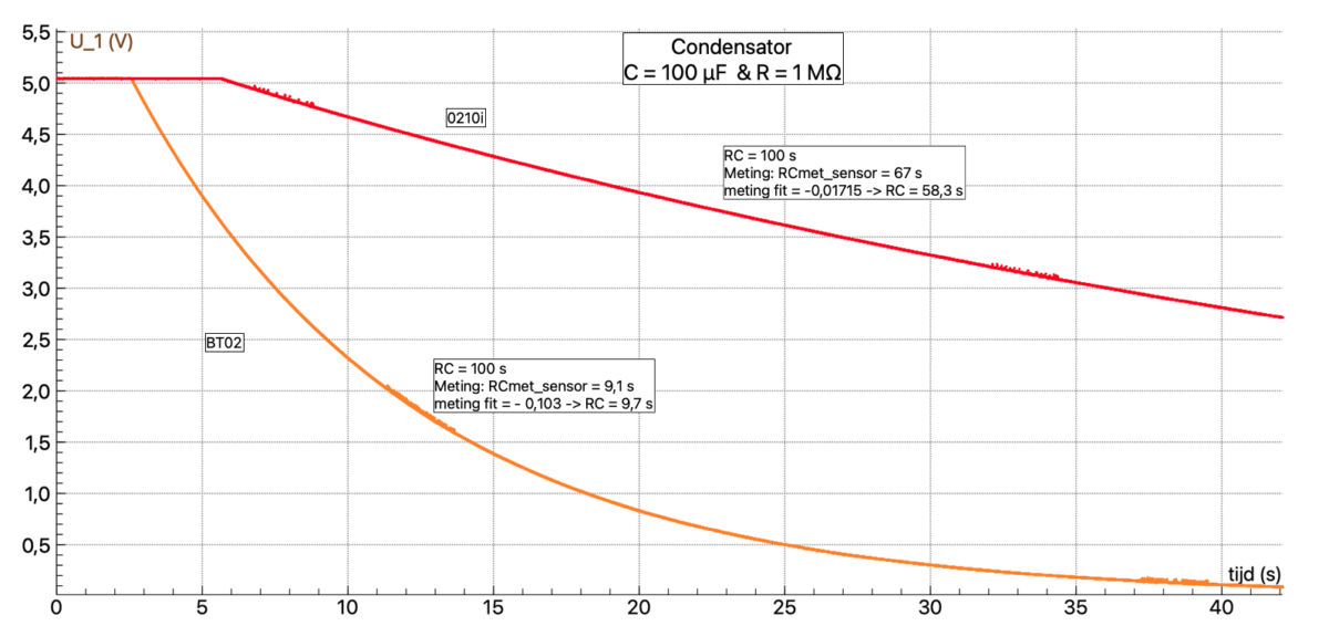Figuur 2. Meting aan dezelfde combinatie van R en C, geeft met gebruik van verschillende spanningssensoren afwijkende waarden voor de RC tijd die met de inwendige weerstand van de spanningssensoren goed te verklaren zijn.