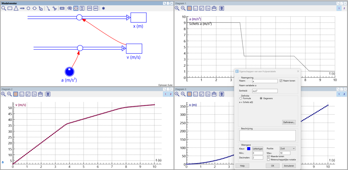 Figuur 1: In dit eenvoudige model is een schets (rechtsboven) gemaakt van de versnelling a. Deze schets is gekoppeld als data voor de variabele a in het grafisch model (linksboven). U ziet de koppeling aan de schetsdata, doordat er een vierkantje in het rondje van de variabele a verschenen is.