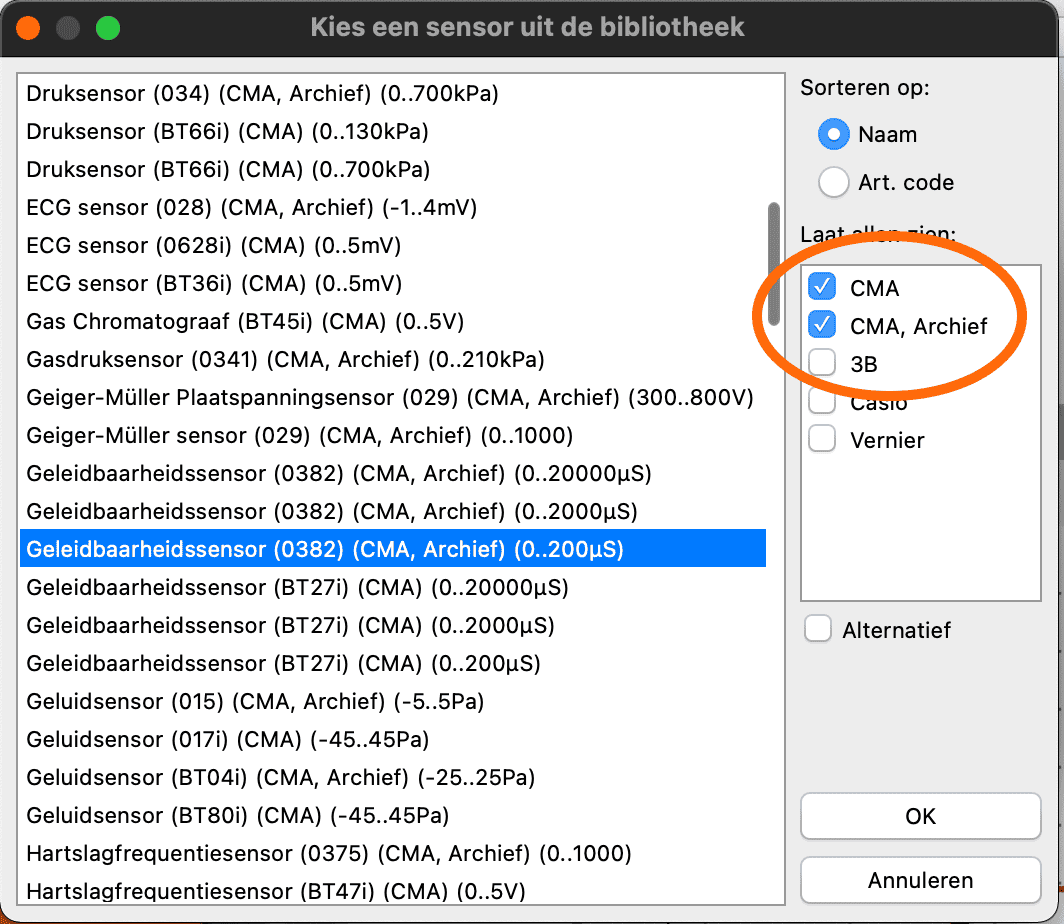 1. Heeft u nog een oude sensor die als aansluiting 4 mm pluggen (rood, zwart en gele snoeren) heeft? Deze kunt ook op een BT ingang van een interface aansluiten met een koppelstuk (4mm naar BT). U moet dan wel zelf de sensor uit de CMA bibliotheek kiezen. Klik rechts op de interface ingang in Coach 7 en selecteer kies een sensor of vervangen. Kies in de CMA bibliotheek de sensor die u heeft aangesloten. Als de sensor wat ouder is kan het zijn dat u een vinkje bij CMA Archief moet zetten om de betreffende sensor te vinden.