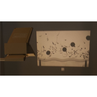 Deze beweging wordt helder en over een groot oppervlak geprojecteerd met behulp van een overheadprojector.