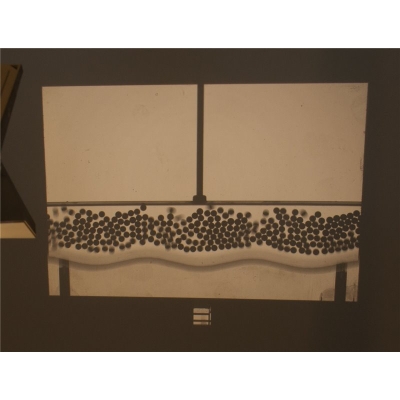 Glazen kamer op een metalen plaat, met een gemotoriseerde zwenkbalk, die kleine metalen bolletjes in beweging zet.