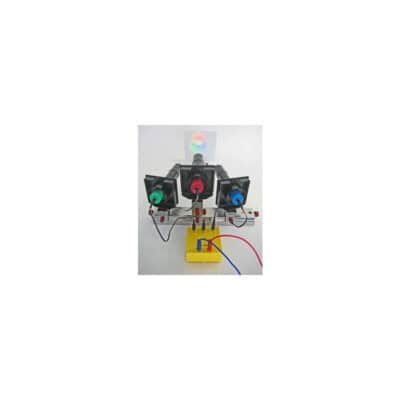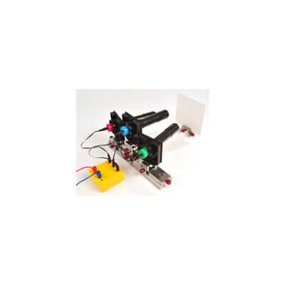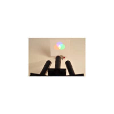 Diodelampen voor additieve kleurmenging: Drie super heldere LEDs voor de additieve kleuren, een condensorlens en de beweegbare lenstubus met geïntegreerde beeldlens zorgen voor een scherpe weergave van de “kleurcirkels” op beeldschermen op afstanden van circa 15 tot 90 cm.