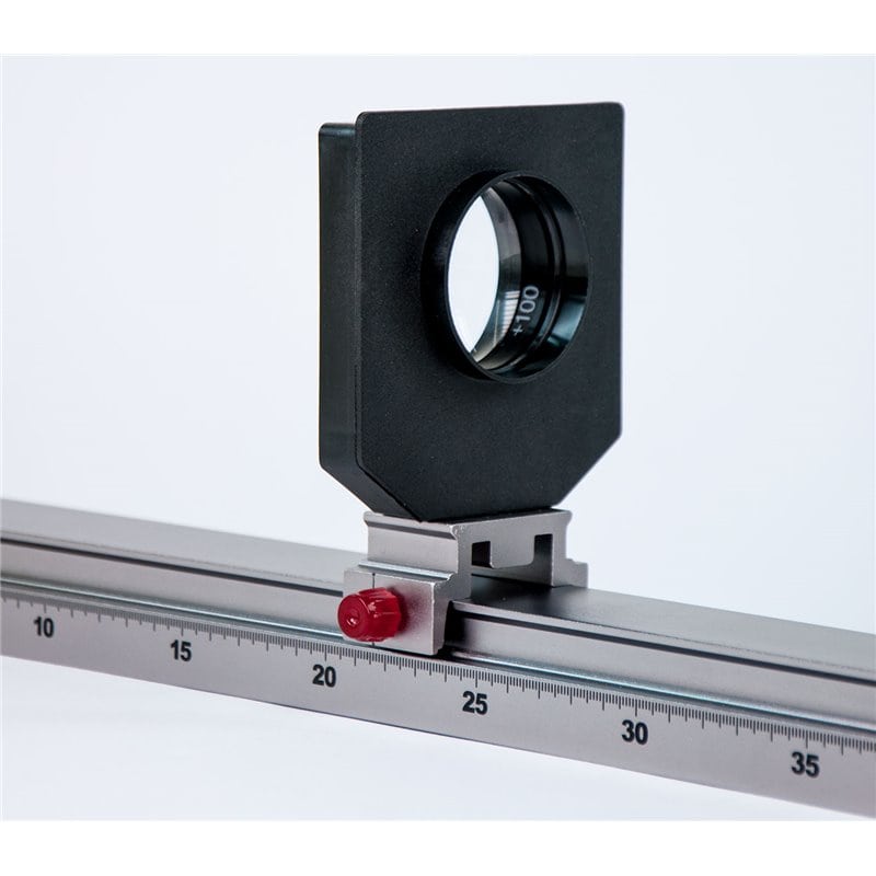 Glazen lens met brandpuntafstand van +100mm in een kunststof houder waar de brandpuntsafstand op gedrukt staat. Voor gebruik op een optiekbank, dmv de lens- en diafragmahouder. Diameter lens zelf: 50mm.