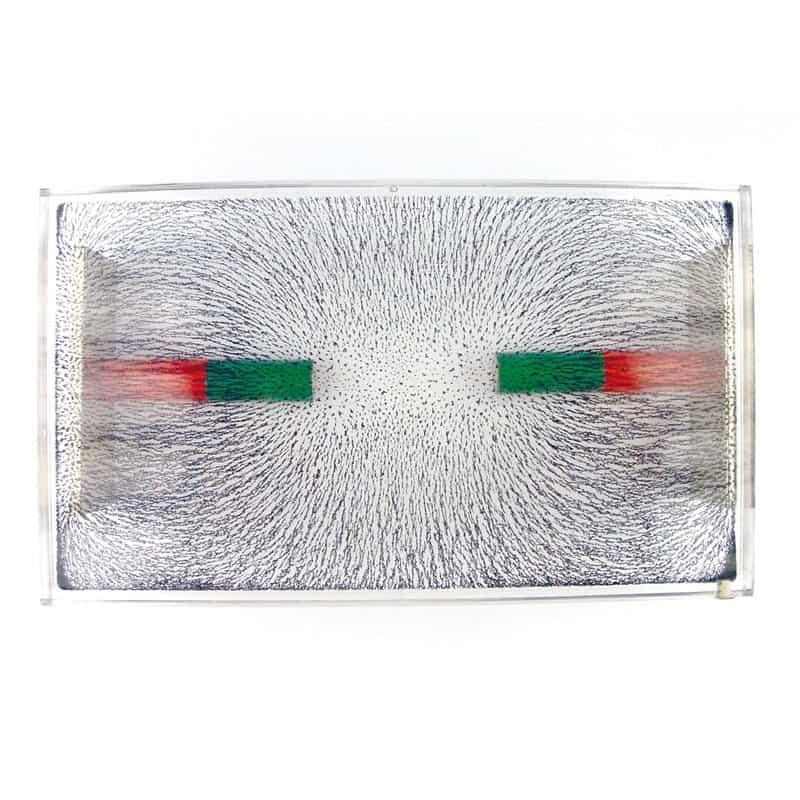 De vloeistof lijnt het vijlsel veel beter uit in de vorm van magnetische veldlijnen dan bij conventionele experimenten met vijlsel op karton of een acrylglasplaat.