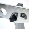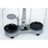 Weegbalk met nulstelschroeven, lange metalen wijzer met schaalverdeling, draaibare steunplaat voor drijfvermogenmetingen, vergrendelknop, grondplaat met stelschroeven en waterpas voor nauwkeurige horizontale positionering van de weegschaal.