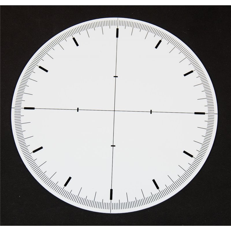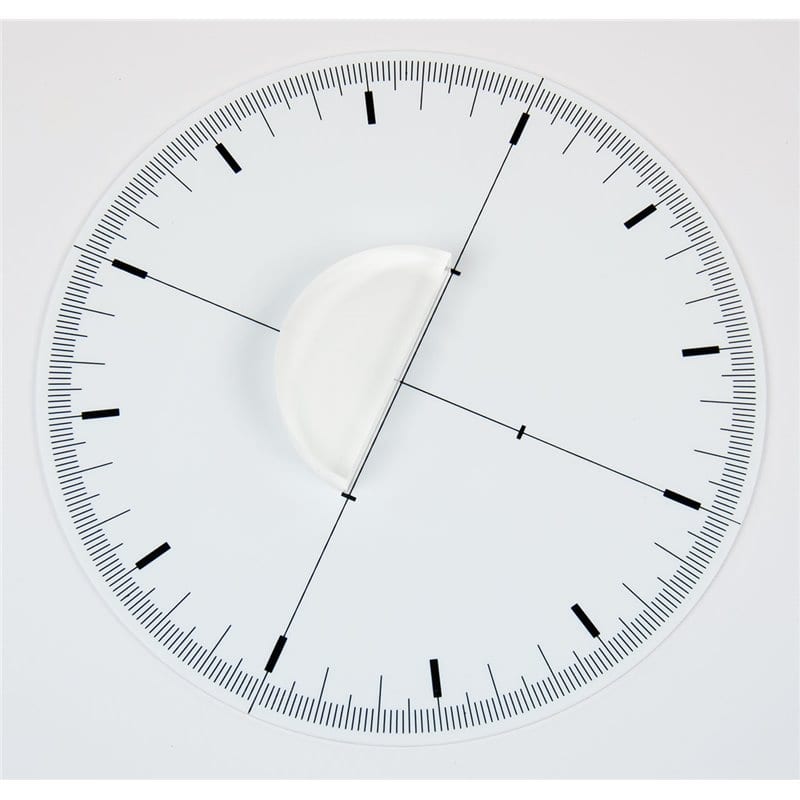 Optische schijf met gradenverdeling, voor practicum met spiegels of lenzen, waardoor snel en nauwkeurig de invalshoek, reflectie of refractie, evenals de brekingsindex, kan worden bepaald.